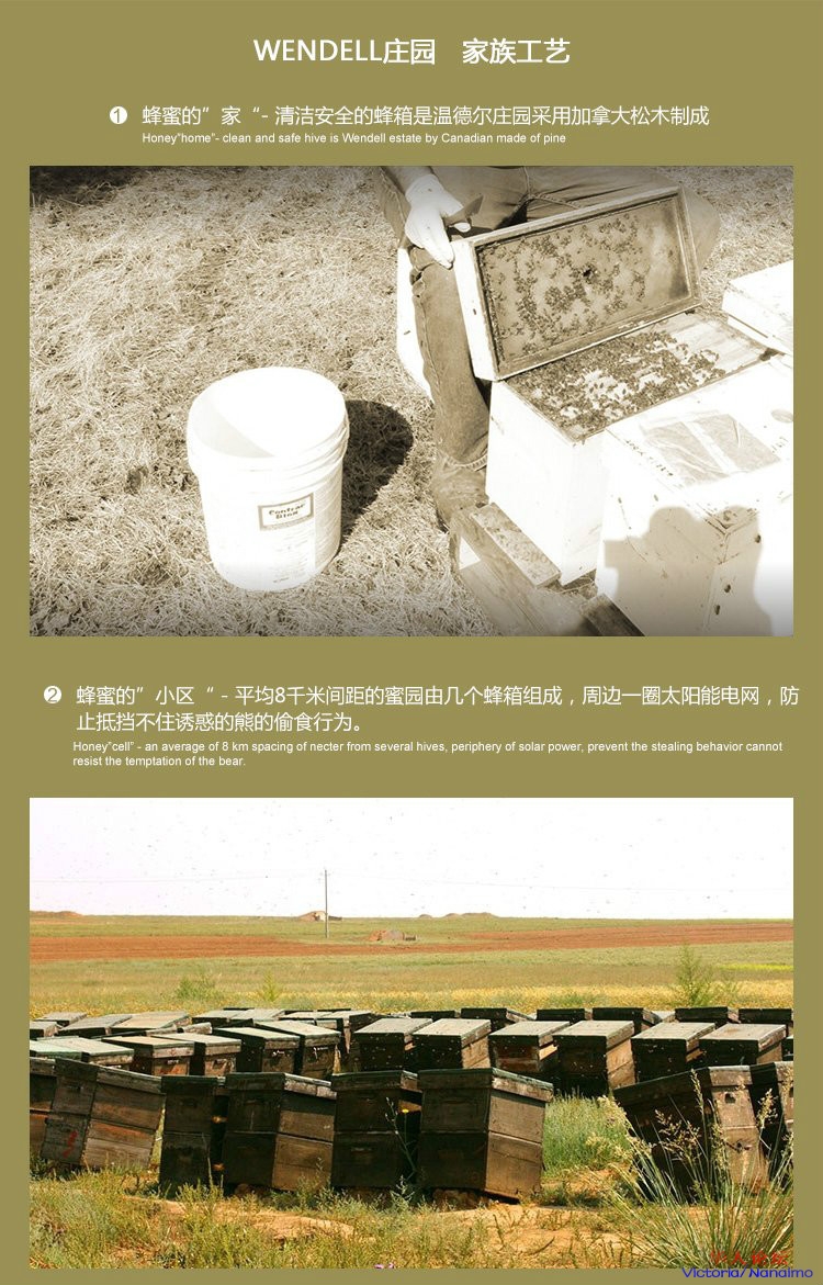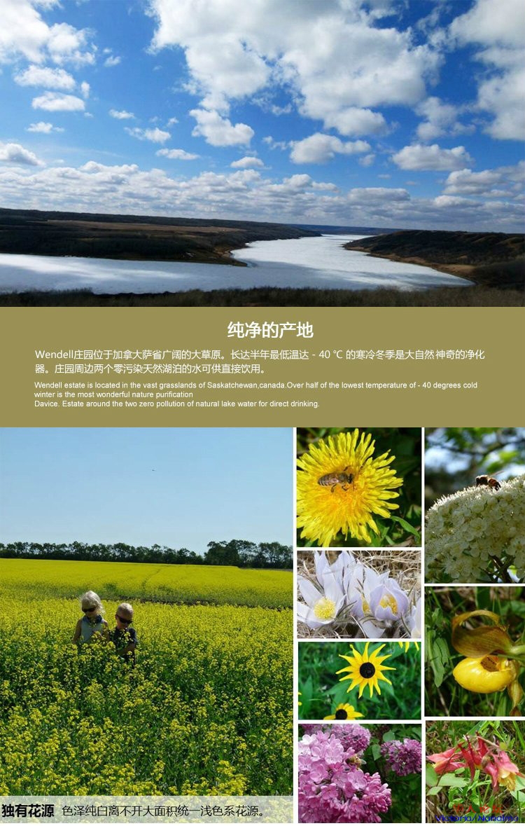 温德尔养蜂庄园坐落在加拿大萨斯喀彻温省(萨省)。萨省这片富饶的土地一向被誉为加拿大的“产粮之篮”。萨省著名的金三角区,更是以牧场,麦田及其优美的自然环境而闻名,这就是温德尔养蜂庄园的所在之处。蜂园是温德尔家族的祖业,从1940年开始,致力于生产加拿大一级蜂蜜。蜂园所产的世界顶级白蜜更是被美誉为“蜂蜜中的爱马仕”。曾多次被加拿大国家电视台报导。目前,温德尔白蜜多在加拿大及美国的各大有机超市销售。