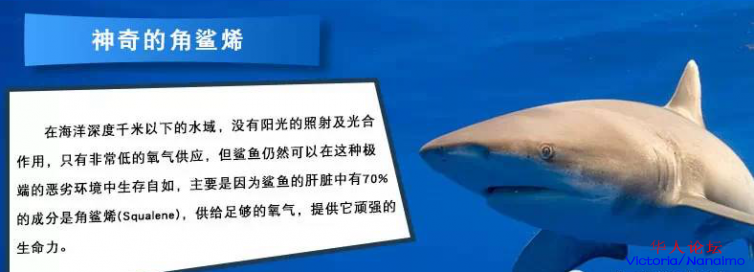 深海鲨鱼作为一种史前生物,在其肝脏富含高浓度的角鲨烯,这种物质是再其他任何鱼油内所找不到的。靠海吃海的人民祖祖辈辈收益于这种海下1000米的神奇生物,而健康长寿。日本是世界上平均寿命最长的国家,而鲨鱼是其主要食品之一。在日本,鲨鱼肝油被视为万能神药,被用于各种病症的辅助治疗。