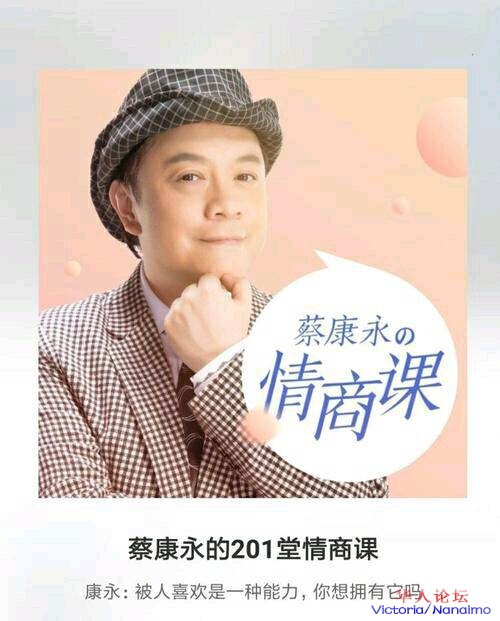 以上所述都是在蔡康永的情商课里看到的康永哥的每一堂课程,都有认知心理学方面的学术观点作理论根基,但最关键的是,他回应的都是真实而具体的生活场景。康永哥化繁为简,在课程中提炼出了5种核心能力,包括:情绪管理力、个性塑造、态度养成、领导力,以及个人魅力。你在社交、家庭、爱情和职场等所有场合,能遇到的所有你认为与情商相关的困惑,都可以通过这5种能力得到化解。如果在国外照样倾听,请上Fancast倾听康永哥教你如何与人愉快的相处,这可是Fancast独家免费才有的哦康永哥的情商课,教你的绝对不是屠龙之技、更不是课堂上背教科书,而是每一课都有一个看得到的小收获,是你能马上拿来能用的小技巧。