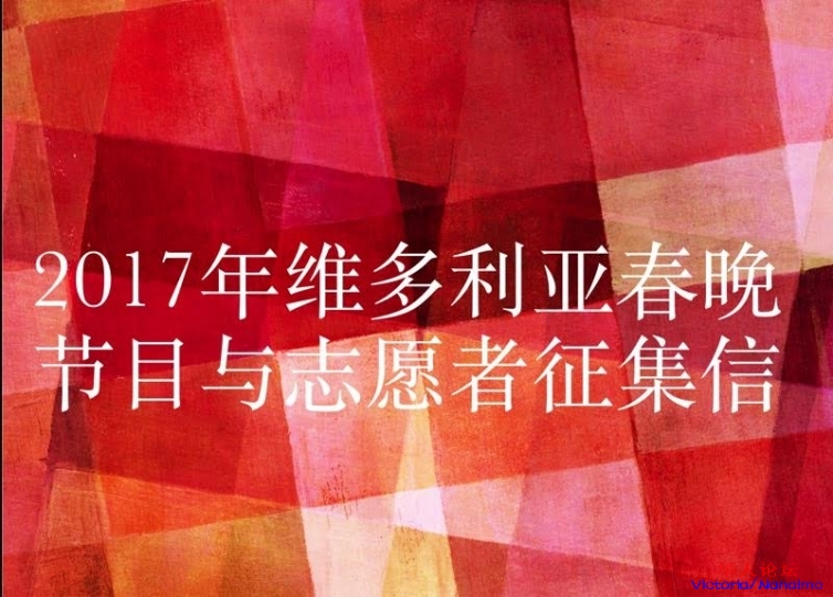 - \. N4 F5 o p6 q, A 2017维多利亚春晚组委会愿与您一起为我们的华人社区和本地其他族裔的观众朋友们奉献一台精彩纷呈的晚会。不要让我们错过您的精彩,来和我们一起闪亮登场吧!- z! p ~1 P- u/ h0 r E