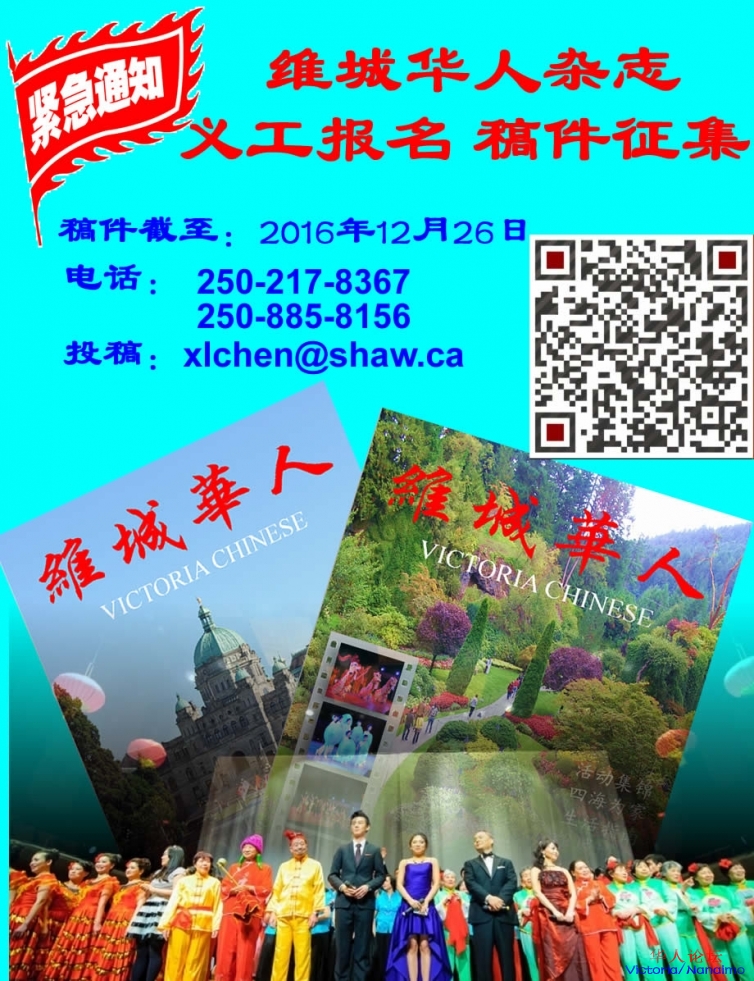 《维城华人》杂志隶属维多利亚华人协会,她伴随着维多利亚华人春晚诞生,越来越为大家所人口,今年已经是第六个年头了。新的一期《维城华人》杂志2017年第一期将于1月出版,现向所有生活在维多利亚的华人诚征稿件。稿件内容可涉及本地社团活动,新闻采编,活动纪实,以及作者自己的杂感随想,形式不限,随笔、散文、小说、诗歌均可。稿件长度请控制在1500字左右。稿件如被采用,我们将对作者酌情给予酬谢。如向本刊推荐优秀作品,请注明文章出处,以便我们征求原作者或出版者同意% |; E' j# r. L* o J8 w