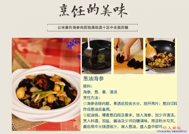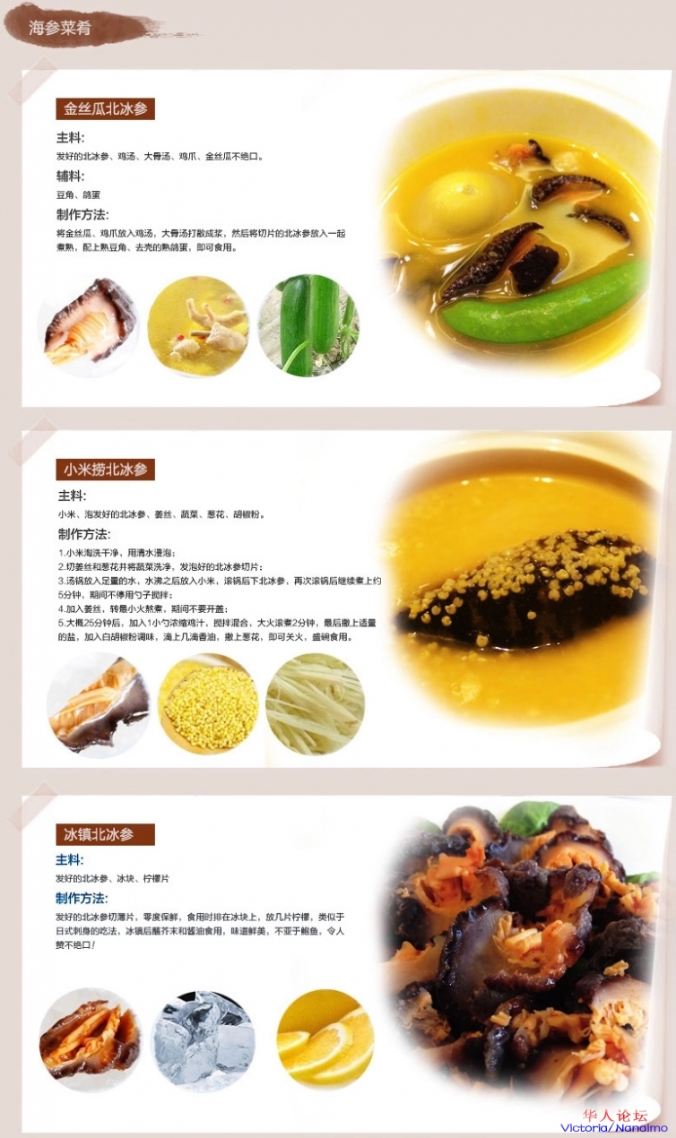 将海参放入水中浸泡两天(水是海参的三倍)。然后更换清水煮滚,调至慢火煮约60分钟,再换清水清洗后即可煮食,可拌同各种肉类、香菰等炆淋后即可享用。「唯一」加拿大海参是全部可以食用的。