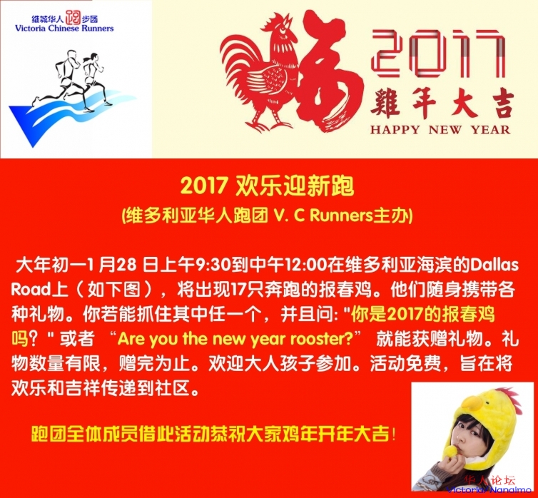 ) N3 N( h7 P0 G: g" V1 x$ ?辞猴迎鸡,我们从活动筹备之初就得到了新春的祝福——维多利亚资深华人房产经纪Winnie Wu (2504809908)、Peterson 装修公司(7789225005)和维多利亚华人接待服务中心(微信pscc20150801)提供的赞助。本次活动完全免费,欢迎大家踊跃参加! 17位带着2017鸡年祝愿的报春鸡志愿者已经准备就绪,就等着你们来抓住他们,并说出鸡年的吉祥语:“你是2017的报春鸡吗?”一起来,追逐报春鸡,迎接新春到来吧!